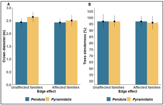 Variation in the stability traits: crown diameter (A) and tree slenderness (B) by the edge effect. The black vertical lines represent the standard deviation.