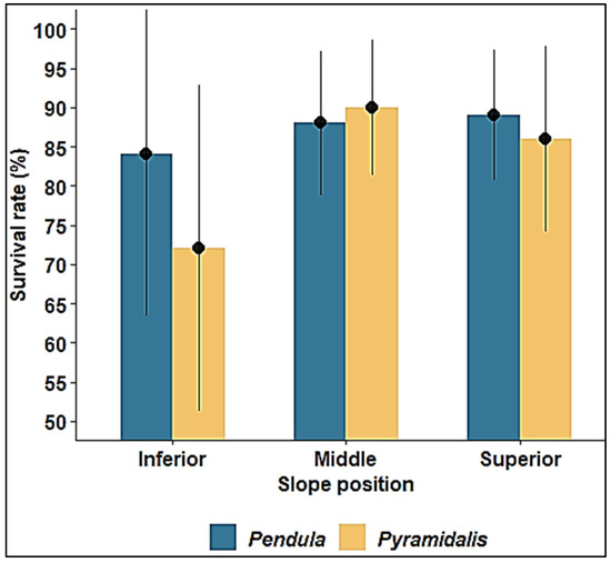 Slope position was one of the microenvironmental factors that influenced the survival of the trees in the Măneciu trial, and the Sr differed significantly between the three slope positions for both varieties of spruce (p < 0.001).