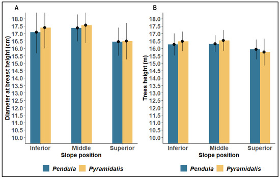Variation in the growth traits: diameter at breast height (A) and tree height (B) by the slope position. The black vertical lines represent the standard deviation.