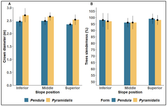 Variation in the stability traits: crown diameter (A) and tree slenderness (B) by the slope position. The black vertical lines represent the standard deviation.