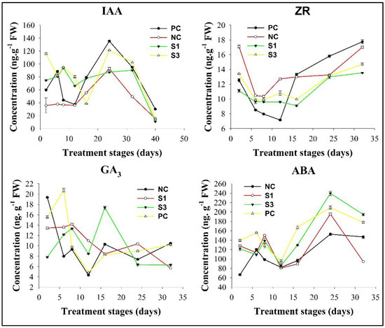 Fluctuation patterns of endogenous hormones in differently treated shoot samples. These curves were drawn according to the mean value of endogenous hormone concentrations in three biological replicates and error bars represented ± SD.