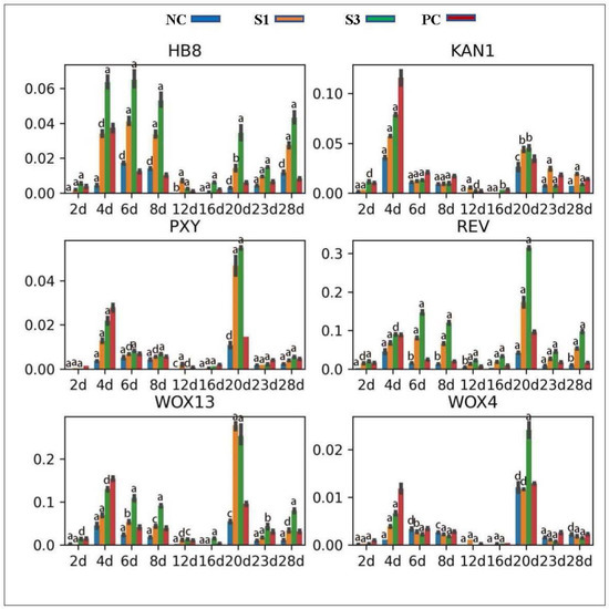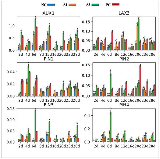 Expression profiles of AUX1/LAX and PIN family genes in differently treated samples. Three biological replications were included. The reference gene was ubiquitin 10 (UBQ10). a, b, c and d represented the difference in gene expression levels in the samples treated by exogenous IAA compared to those in PC. a, p-value < 0.001; b, p-value < 0.01; c, p-value < 0.05; d, p-value > 0.05. Similar parameter settings were performed in the following figures.