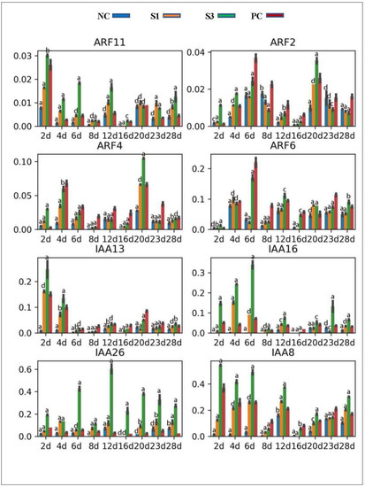 Expression profiles of AUX/IAAs and ARFs in differently treated samples. a, p-value < 0.001; b, p-value < 0.01; c, p-value < 0.05; d, p-value > 0.05.