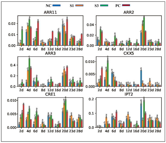 Expression patterns of CK synthesis—and signaling-related genes in differently treated samples. a, p-value < 0.001; b, p-value < 0.01; c, p-value < 0.05; d, p-value > 0.05.