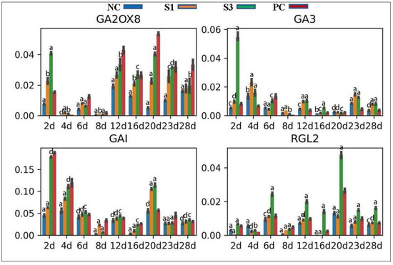 Expression patterns of genes participating in GA production and signaling transduction in differently treated samples. a, p-value < 0.001; b, p-value < 0.01; c, p-value < 0.05; d, p-value > 0.05.