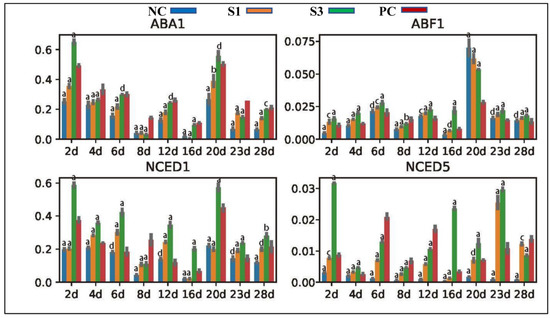 Expression profiles of genes participating in ABA production and signal transduction in differently treated samples. a, p-value < 0.001; b, p-value < 0.01; c, p-value < 0.05; d, p-value > 0.05.