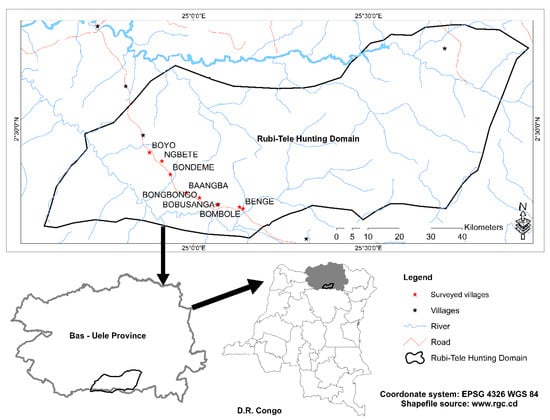 The study was conducted in RTHD, located in the Bas-Uélé Province. This province lies in the northern region of DR Congo, on the borders with South Sudan and the Central African Republic, and has a total area of 148,331.00 km2. Order N°51/Agri./12 December 1930 established the RTHD between the Rubi and Tele rivers and Order N°64/Agri./28 November 1932 modified [94]. This protected area, which has an extent of more than 8000.00 km2, was established as a “Hunting reserve” only six years after the establishment of Virunga National Park. The RTHD comprises 9080.00 km2 of land, according to the World Database on Protected Areas (WCMC, UNEP). A hunting ban is the main management measure applied in this area (Article 2 of the Legal Act of 1930). Additionally, Articles 2 and 3 of the Legal Act of 1930 contain additional provisions that allowed the lifting of the hunting restriction for specific species subject to authorization or permits provided to various groups of beneficiaries, including rural households. The preservation of huge fauna is the main management goal of this protected area [95].