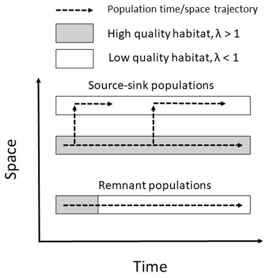 A graphic illustration of the difference between source-sink and remnant populations (“source-sink populations in time”). Adapted from Ref. [59].