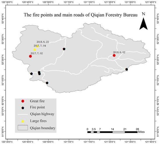 Qiqian Forestry Bureau is located at the edge of the northern foot of the western slope of the Great Xing‘an Range. Its geographical coordinates are 120°36′18″–121°42′50″ E and 52°01′42″–52°35′00″ N. The total area of the Forestry Bureau is 288,330 hectares, all of which are forest land. Among them, the area of forest land is 273,688 hectares, and the coverage rate of the forest is 95.4%. According to the statistics of the National Bureau of Statistics, in the past five years, there have been four forest fires in Qiqian Forestry Bureau, including two great forest fires and two large fires, as shown in Figure 1. The area of forest overfire is about 1213 hectares, and a total of 2445 people have been put into force, resulting in huge losses of human and material resources, and also a serious impact on China’s ecological environment.