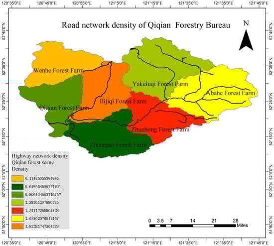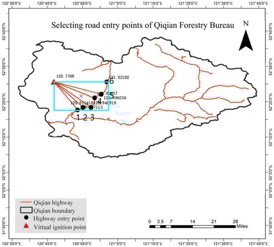 As shown in Figure 2, the density of the road network in the west of Qiqian Forestry Bureau is relatively low. The mileage of the effective road section in the original forest area is about 331 km, and the total area of the forest area is 288,300 hectares. The density of the road network is about 1.09 m/ha, which is far less than the average density of the road network in the current state-owned forest area of 1.8 m/ha. The distance between the road and the fire point is far, which seriously affects the fire suppression efficiency, leading to the missed optimal time for fire suppression and aggravating the spread of fire []. The National Forest Fire Prevention Plan (2016–2025) proposed that the road network density of state-owned forest areas should reach 3.1 m/ha in 2025, indicating that the road network density in the region needs to be improved []. The road entry point is the starting point from the existing road into the forest area. When the forest is on fire, a car can only bring the responding team to the nearest road entry point to the fire. The rest of the road must be walked. The fire suppression tools and supplies carried by each person make the weight of each person less than fifty or sixty kilograms, and more than eighty or ninety kilograms. Therefore, reasonable planning of road entry points to ensure that fire-fighting personnel and supplies can quickly reach the fire site is the main purpose of forest fire fighting path planning.