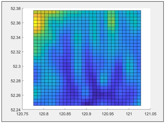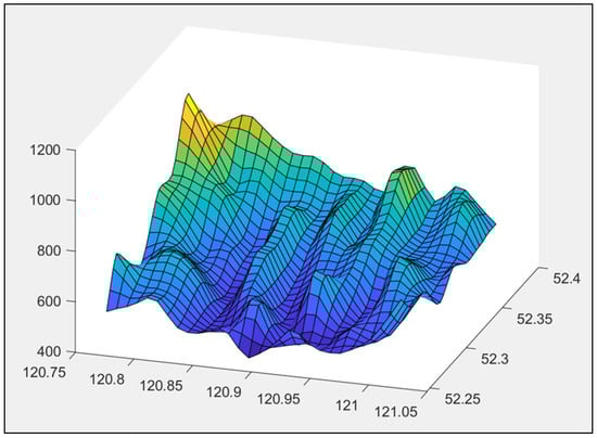 There are many methods for environmental modeling, such as the visual graph method, tangent graph method, grid method, and unit tree method []. Since the ant colony algorithm requires parameter assignment and position retrieval of any point in space, it is necessary to rasterize Qiqian Forest Bureau. The digital elevation model (DEM) is a data set of plane coordinates of regular grid points and their elevations within a certain range that mainly describes the spatial distribution of regional geomorphology and is formed by data collection including sampling and measurement through contour lines or similar three-dimensional models, and then data interpolation. Obtain the DEM data of Qiqian Forestry Bureau, determine the coordinates of the virtual fire point (120.7765, 52.3770, 853), intercept the 20 km × 15 km DEM as shown in Figure 3, using ArcGIS to process the obtained real 3D spatial environment information as a function to obtain the longitude, latitude, and altitude data of the study area, and build the three-dimensional spatial model (which is constructed by Matlab drawing tool; the three axes are longitude, latitude and altitude in turn). Figure 4 shows the rasterized view of the 3D model, and the 3D spatial topographic map of the 3D model is shown in Figure 5.
