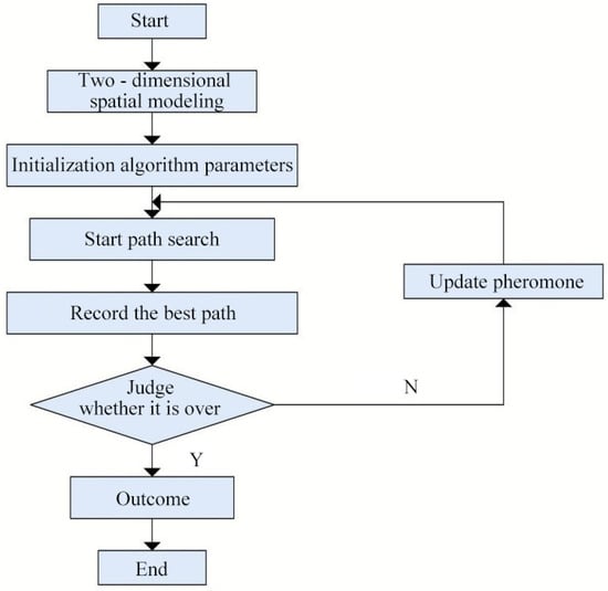Ant individuals transmit information through a substance called pheromone. Ant individuals can release pheromones and perceive their strength to guide their movement direction []. When they meet an uncrossed intersection, they randomly select a path and release pheromones related to path length, so that the pheromones of shorter paths will be stronger, and the pheromones will also weaken over time. Eventually, a positive feedback is formed: the pheromone concentration on the shorter path becomes larger and larger, while the pheromone concentration on the other paths decreases with time, and eventually the whole colony will find the optimal path [].