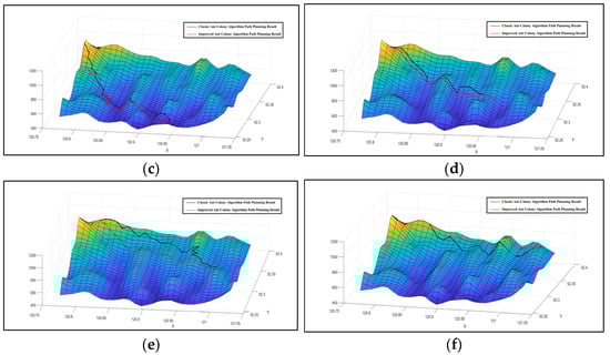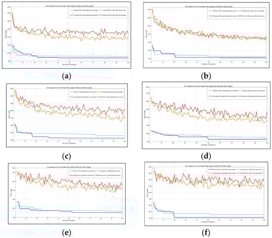 The comparison of required path length before and after improvement is shown in Table 2. In Experiment 1, the path length before improvement was 102.8 km, the path length after improvement was 95.61 km, and the shortened path was 7.19 km, about 7.0% of that before improvement. In Experiment 2, the path length before improvement was 101.00 km, the path length after improvement was 94.60 km, and the shortened path was 6.4 km, about 6.4% of that before improvement. In Experiment 3, the path length before improvement was 124.70 km, the path length after improvement was 109.90 km, and the shortened path was 14.8 km, about 11.9% of that before improvement. In Experiment 4, the path length before improvement was 100.40 km, the path length after improvement was 90.90 km, and the shortened path was 9.5 km, about 9.5% of that before improvement. In Experiment 5, the path length before improvement was 106.00 km, the path length after improvement was 101.10 km, and the shortened path was 4.9 km, about 4.6% of that before improvement. In Experiment 6, the path length before improvement was 90.89 km, the path length after improvement was 81.88 km, and the shortened path was 9.01 km, about 9.9% of that before improvement. The improved path length shown in the path planning research with the road entry point as the starting point under different linear distances is smaller than that before the improvement, indicating that the updating and improvement method for pheromone in this paper can effectively deal with the optimization problem of cross-country road fire suppression path in forest environment. At the same time, the paths before and after optimization and the degree of optimization corresponding to different road entry points are different, and the road entry point with longer linear distance in this experiment shows the shortest cross-country path distance and better optimization degree, that is, the results obtained in experiment 6.