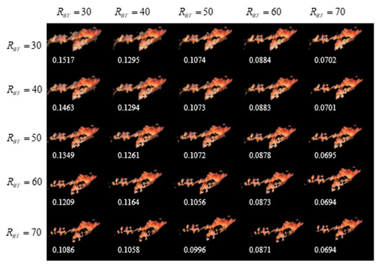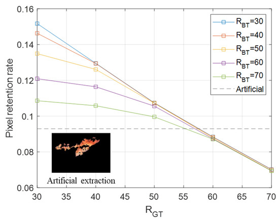 Here, RGT is the red–green color threshold and RBT is the red–blue color threshold. Select 30, 40, 50, 60, and 70 for RGT and RBT, and calculate the extraction results and pixel retention rate of RGB algorithm under different RGT and RBT conditions [29,30,31]. Our results are shown in Figure 2 and Figure 3: