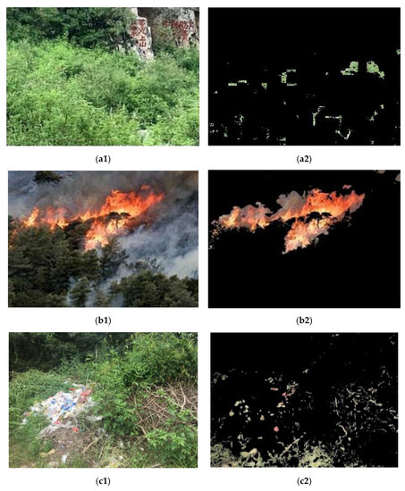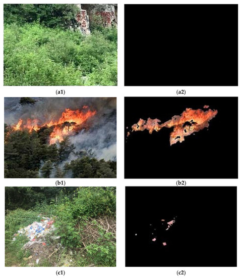 Extraction results via YCbCr color space: (a1) Forest image without fire; (a2) extraction results of forest image without fire; (b1) forest image with fire; (b2) extraction results of forest image with fire; (c1) forest image with fire-like interference; (c2) extraction results of forest image with fire-like interference.