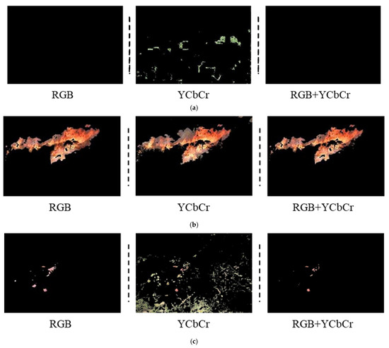 Comparison of RGB, YCbCr, and fusion RGB-YCbCr results: (a) extraction results of forest image without fire; (b) extraction results of forest image with fire; (c) extraction results of forest image with fire-like interference.