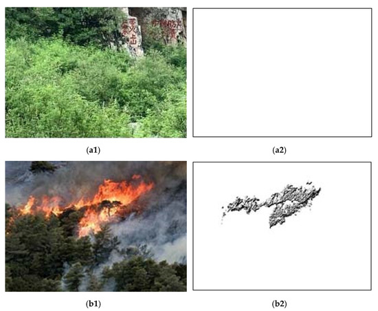 Extraction results via RGB color space: (a1) Forest image without fire; (a2) extraction results of a forest image without fire; (b1) forest image with fire; (b2) extraction results of forest image with fire; (c1) forest image with fire-like interference; (c2) extraction results of forest image with fire-like interference.
