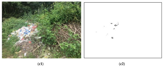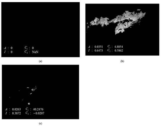 This method was implemented in MATLAB R2019a. The operating system of the experimental platform was Windows 11, and the processor was Intel® CoreTM i5—9300H. A total of 1317 forest images were collected from the field, including 513 forest images without fire, 420 forest images with fire, and 384 forest images with fire-like interference. The forest images included a variety of common trees in China, such as birch, pine, cypress, etc. The forest fire images selected were mainly close range or high-definition images because their color and textural features are more obvious. The types of fire-like interference included red garbage, red stripes, a red leaf forest, etc. Some of the images of the recognition process regarding the three scenes are presented as Figure 10. Figure 10a is a normal forest image without fire, and obviously there was no extracted fire region after the color extraction process. Figure 10b is a forest image with fire, while Figure 10c is a red banner in the forest, which was used as interference in this study.
