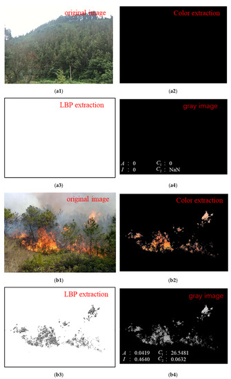 Figure 6 indicates that by comparing the different segment results with the original image, some green and red interferences were excluded, and the fire area was successfully extracted, indicating that the algorithm has strong robustness. From the comparison between Figure 6b,c, there were obvious differences between the textural features of flame and interference sources. Therefore, considering the special textural features of forest fires, the LBP and GLCM algorithm are used to characterize the textural feature-based information of a suspected fire region for recognition and classification.
