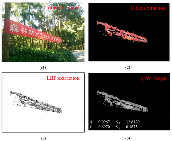 Experimental image sample and extraction results: (a1) forest image without fire; (a2) color extraction result of forest image without fire; (a3) LBP extraction result of forest image without fire; (a4) gray image of forest image without fire; (b1) forest image with fire; (b2) color extraction result of forest image with fire; (b3) LBP extraction result of forest image with fire; (b4) gray image of forest image with fire; (c1) forest image with fire-like interference; (c2) color extraction result of forest image with fire-like interference; (c3) LBP extraction result of forest image with fire-like interference; (c4) gray image of forest image with fire-like interference.