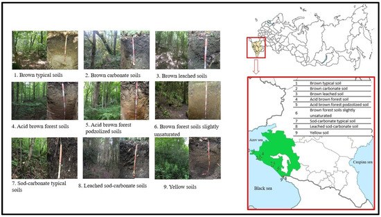 Soil samples for the model experiments were selected from the top layer of 0–10 cm, as most of the pollutants are retained in non-arable soils (Table 1 and Figure 1). The main soils of the wet and dry subtropics were selected as the objects of this research. In this territory, there is a wide variety of soil types, which can probably be distinguished by their resistance to anthropogenic influences. Yellow soils were found only in the Sochi region and made up 0.05% of the country’s area [40,41].