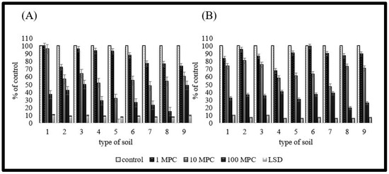 Copper contamination with a dose of one MPC negatively affected the length of plant roots significantly: the root length was decreased by 14% in brown typical soil, 22% in yellow soil and sod-carbonate typical soil, 31% in brown eluviated soil, 33% in sod-carbonate eluviated soil, 43% in brown forest slightly unsaturated soil, 45% in brown carbonate soil, 64% in brown forest acid soil, and 88% in brown forest podzolic soil (Figure 5).