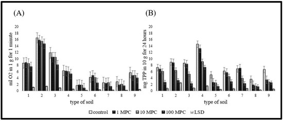 The reasons for choosing these biological indicators are described below. The total number of bacteria in the soil reflects the state of decomposers in the ecosystem. The activity of oxidoreductases, i.e., catalase, and dehydrogenases indicates the rate of mineralization of organic substances in soil. Moreover, oxidoreductases are highly sensitive to chemical contamination in comparison with other classes of enzymes. The enzyme activity of soils determines the potential biological activity of soil, and cellulolytic activity determines the actual activity. The seed germination rate and the length of the radish roots aid in the determination of soil phytotoxicity, and the intensity of the initial growth and development of plants.