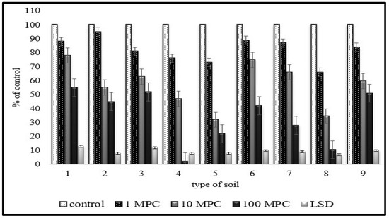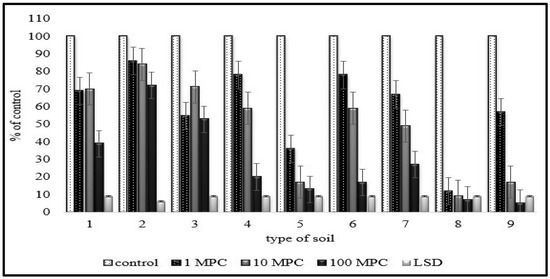 The highest resistance to Cu contamination with respect to the changes in IIBS was found in southern chernozem, brown leached, and brown typical soils—IIBS was lowered by 18, 20, and 21% relative to the control, respectively (Figure 6).