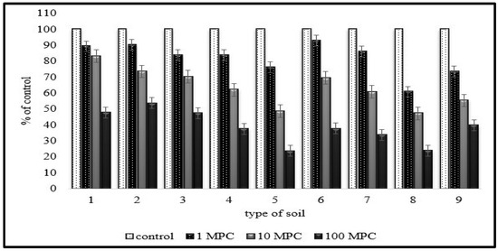 A significant decrease in Azotobacter sp. abundance was found in the soil contaminated with one maximum permissible concentration (MPC) of Cu: for sod-carbonate typical soil, a decrease of 12% occurred; sod-carbonate eluviated and brown forest podzolic soils-23%; brown forest slightly unsaturated soil-26%; and brown typical soil-27% of control (Figure 2). While at 10 MPC of Cu, decreases in Azotobacter sp. abundance were observed for brown carbonate, brown forest slightly unsaturated, brown typical, sod-carbonate typical, brown forest podzolic soils, and yellow soil of 36, 40, 43, 45, 46, and 48%, respectively.