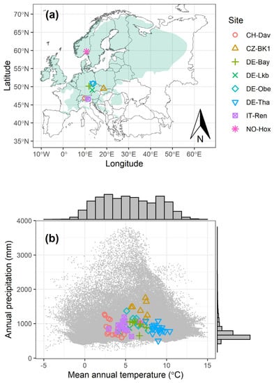 The selected study sites are mostly in central Europe apart from NO-Hox which is located in northern Europe (Figure 1a). During the study years, the annual mean temperature ranged from 2.4 °C (CH-Dav) to 10.4 °C (DE-Tha) and the annual precipitation varied from 502 mm (DE-Tha) to 1748 mm (CZ-BK1) (Table 1). This climate range covers most regions where Norway spruce currently grows except the areas with cold climate (i.e., mean annual temperature < 2.5 °C) in Russia and warm climate (i.e., mean annual temperature > 11 °C) in southern Europe (Figure 1b).