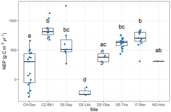 Annual NEP at each study site. The solid lines in the boxes are medians. The lower and upper hinges are the first and third quartiles, respectively. The upper and lower whiskers represent the largest and smallest values within 1.5 times of the interquartile range (distance between the first and third quartiles) from the hinge. Blue points are annual NEP values. Different letters above the boxes indicate significant differences in NEP among the sites (p < 0.05) based on one-way ANOVA followed by Tukey’s HSD test.