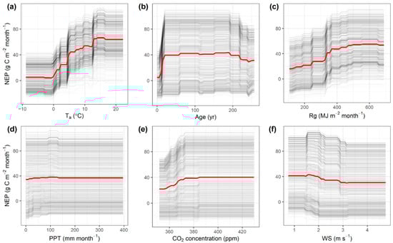 Partial dependence plots for NEP with respect to changes in: (a) air temperature (Ta); (b) age; (c) global radiation (Rg); (d) precipitation (PPT); (e), CO2 concentration; (f) wind speed (WS). The red curves indicate the average partial relationships. Grey curves are individual conditional expectation (ICE) curves that represent the partial relationship across individual observations in the data.