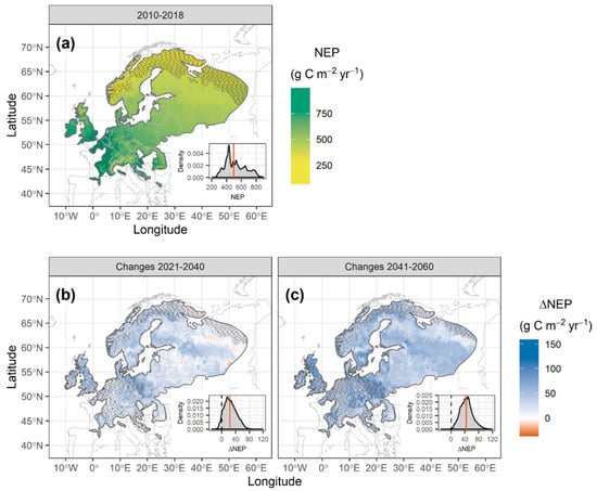 NEP predictions for mature Norway spruce forests based on the climate during 2010–2018 (a) and the predicted changes in NEP values during 2021–2040 (b) and 2041–2060 (c) under the SSP2-4.5 scenario as compared with the NEP values in 2010–2018. The frequency distribution of the values in each map is presented in the corresponding inset with the red vertical lines indicating the medians. The predictions were performed in areas of current Norway spruce forest distribution in Europe. Areas with Ta that are beyond the range of the used data are marked with black shadows.