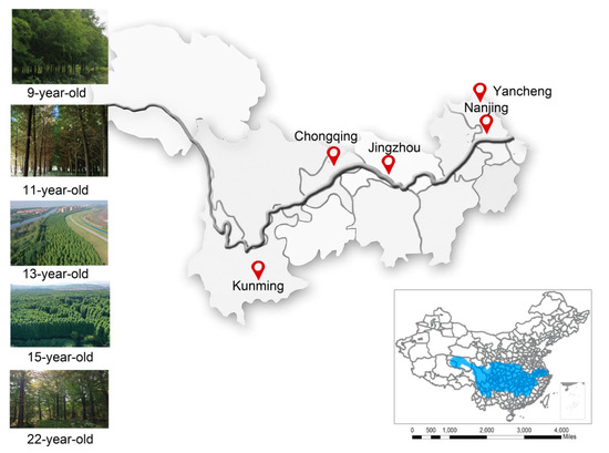 The forests both natural and artificial are rigorously conserved in the YRB, and T. Zhongshanshan plants should be sampled without felling or seriously damaging them. Given this, the destructive tree sampling for allometric models was conducted at the experimental base of Institute of Botany, Jiangsu Province and Chinese Academy of Sciences, which is located in the Qixia and Liuhe Districts, Nanjing and Tinghu District, Yancheng (Figure 1). These areas experience a typical subtropical monsoon climate. The mean annual temperature is 15.8 °C and the mean annual precipitation is 1085 mm, of which 65% falls during June-September. The study areas of biomass and carbon storage are located along the Yangtze River, respectively, in the cities of Nanjing, Jingzhou, Chongqing and Kunming (Figure 1). The elevation ranges from 5 m to 1823 m above sea level. Characterized by a subtropical monsoon climate, the annual average temperature ranges from 12.6 to 18.0 °C and mean annual precipitation is about 1076 mm. The areas of the T. Zhongshanshan stands cover from 42 to 201 ha and are managed by the local forestry departments. Understory vegetation was dominated by common herbaceous species included: Erigeron annuus, Alternanthera philoxeroides, Achyranthes bidentata, Chenopodium album, Rubus hirsutus, Angelica sieboldin, Mazus japonicus, Plantago depressa, Setaria viridis and Solidago canadensis, with sparsely scattered woods (mainly Morus alba and Ulmus pumila).