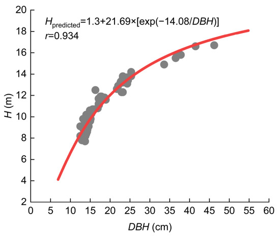 A nonlinear function below was used to model H for the sample tree measured for both H and DBH [13,14]. This function had the flexibility to produce satisfactory curves under most circumstances.