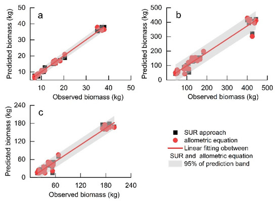 Comparison of the predicted leaf (a), stem (b) and branch (c) biomass against the corresponding observed biomass in T. Zhongshanshan plantations by SUR approach and allometric equation, respectively.