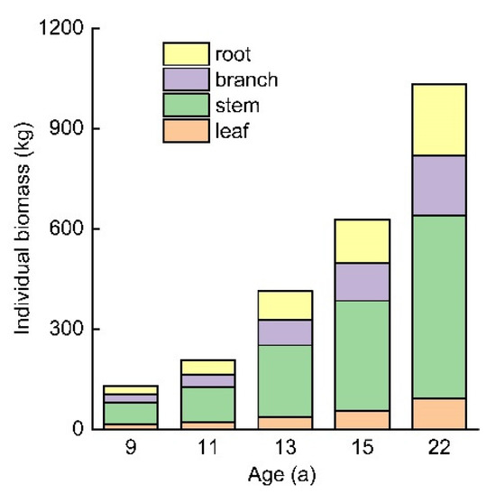 Adopting the equations established by SUR, the biomass of individual tree components was determined in the 9-, 11-, 13-, 15-, and 22-year-old T. Zhongshanshan plants (Figure 4). With increasing stand age, the biomass of all tree components increased. The total individual tree, leaf, stem, branch and root biomass was 156.80, 15.27, 64.20, 23.64 and 26.82 kg of the 9-year-old T. Zhongshanshan plants and increased to1245.72, 93.5, 545.50, 181.01 and 213.08 kg of the 22-year-old plants. With increasing stand age, the proportion of leaf biomass gradually decreased with values of 9.74%, 8.40% and 7.36% in the 9-, 11- and 13-year-old T. Zhongshanshan plants. For all T. Zhongshanshan plants, the stem had the largest proportion of biomass among all components, whose contribution to total tree biomass was 40.94%, 41.95%, 43.00%, 43.38% and 43.79% along the chronosequence, showing a slightly increasing trend. Similar to the stem, individual branch biomass also exhibited a slightly increasing tendency with increasing stand age.