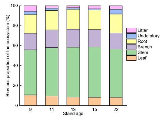 Biomass proportion of the ecosystem from leaf, stem, branch, root, understory and litter in the 9-, 11-, 13-, 15-, and 22-year-old T. Zhongshanshan stands.