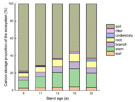 Carbon storage proportion of the ecosystem from leaf, stem, branch, root, understory and litter in the 9-, 11-, 13-, 15-, and 22-year-old T. Zhongshanshan stands.