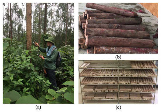 In Vietnam, the shift from harvesting native forest to plantations has occurred because forest plantations grow much faster than native forests and provide an alternative fiber source, protecting mature forests. Since the 1990s, approximately 4.4 million ha of predominately acacia and eucalypt plantations have been established [1]. In addition, a high demand for woodchips has encouraged smallholder farmers to invest in short-rotation species for pulpwood plantations that provide a relatively quick financial return from their forestry land [2]. In recent years, Vietnam has become one of the world’s largest exporters of timber and non-timber forest products with revenue reaching a record high of USD 15.6 billion in 2021, an increase of 18% compared to 2020 [3]. To meet predicted timber production targets for export markets, the Vietnam Government is encouraging tree growers to increase rotation lengths of plantations (typically 5–6 years for Vietnamese acacia and eucalypt plantations) and produce sawlogs. Growing short-rotation sawlogs would add value to this resource compared to pulpwood, which sells at a lower price when compared to solid wood. Eucalypt wood is an important source of raw material for the wood industry, and it may also be used for the production of saw timber and other engineered panels in Vietnam.