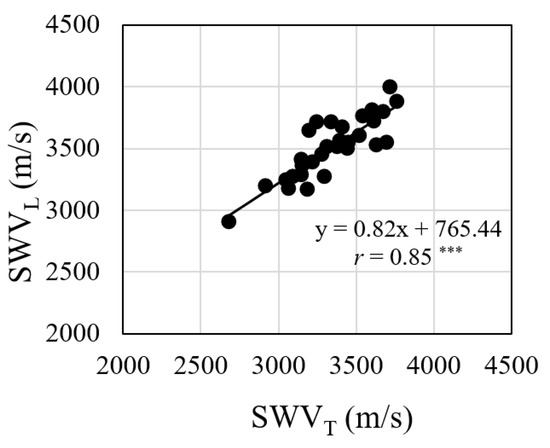 A strong relationship between SWVT and SWVL was observed (Figure 3) for Eucalyptus clones planted in Vietnam under the conditions described earlier, characterized by a coefficient of correlation (r) of 0.85. Several studies have examined the relationship between acoustic velocities measured on standing trees and logs; however, most of these studies were on softwood species. For example, Mora et al. [23] reported a relationship of 0.81 between tree and log acoustic velocities for Pinus taeda and Ishiguri et al. [24] reported a similar correlation (r = 0.87) in Japanese larch (Larix kaempferi). Little information is available on the relationship between SWVT and SWVL on young Eucalyptus. Dickson et al. [25] found a statistically significant coefficient of correlation between SWVT and SWVL (r = 0.62) measured using the Fakopp microsecond timer for Eucalyptus dunnii grown in New South Wales, Australia.