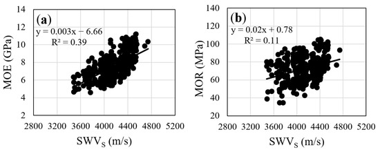 Relationship between stress wave velocity of specimens (SWVS) and static properties: (a) modulus of elasticity (MOE) and (b) modulus of rupture (MOR) for all clones.