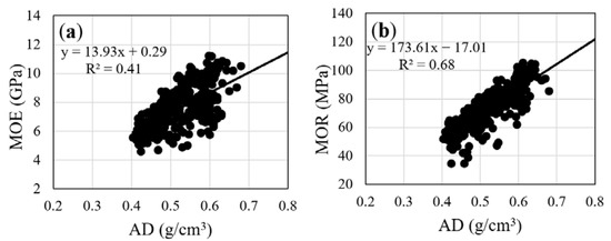 Relationship between dynamic modulus of elasticity (MOEd) and static properties: (a) modulus of elasticity (MOE) and (b) modulus of rupture (MOR) for all clones.