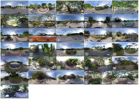 According to previous studies, the feasible distance between recording equipment is 100 m [,,]. We divided Hot Spring Park into grids that were equally distanced at 70 × 70 m [] and selected 31 monitoring points (Figure 1). After our pre-experiment in July 2021, we randomly selected 3 sunny and breezy days for acoustic data collection (contains the weekend) so that our experiment would be more consistent with the actual situation of the park soundscape. Monitoring points were collected by placing a Sony PCM-D100 recording device in the center of a grid; if the monitoring point was inaccessible, an appropriate offset was made. Sampling occurred between 6:00 and 22:00 (park opening hours), and the sampling frequency was set to 44,100 Hz. The data resolution is set to 16 bit and the audio format was WAV. After sampling, we randomly intercepted 2 min of sound files within one hour [], and had an average of 992 min of sound clips per day.