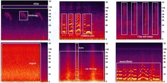 To identify and classify the types of sound sources in urban parks, Adobe Audition was used in combination with spectrograms. Sound events can be visualized through the spectrogram, where brighter and more intense colors indicate a sound with greater power []. In our experiment, each acoustic signal appeared at the end of vocalization as one vocalization event [] (Figure 3). In the statistics of audio, different kinds of sound sources in the same audio can be counted separately in frequency and time length, and sound types can overlap with each other.