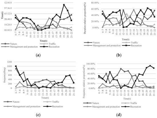 Overall, the soundscape presented a “U”-shaped change feature (Figure 5). Natural sounds occurred more frequently between 6:00 and 9:00 and lasted for a long time. Birdsong dominated the park soundscape, with Heron calls being the main bird soundscape present at noon. Natural sounds lasted longer at night and consisted mainly of insect chirps. Traffic sound dominated the park soundscape between 12:00 and 14:00 in duration. From 15:00 to 16:00, management sounds occupied a dominant position in the park soundscape, with the sounds of engines, park radio, sweeping, and mechanical fountains accounting for a large proportion. The sound of recreation appeared more frequently and lasted longer before 12:00 and after 16:00. The sounds of music and conversation in the morning made a greater contribution to the duration, and the sounds of people clapping, stomping, playing badminton, and walking made a greater contribution to the frequency. The sound of children playing, running and jumping accounted for a considerable proportion after 16:00.