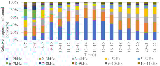 The relative proportion and diurnal variation characteristics of each frequency sound are shown in Figure 7. Sound power decreases with the increase in the frequency. The sound power of 1–3 kHz, mainly from recreation and management sound, accounted for more than 50% of the park’s power. The relative proportion of sound power fluctuated and rose after sunrise, and gradually decreased after reaching the maximum between 13:00 and 14:00 noon. However, the proportion of sound power above 3 kHz showed the opposite trend.