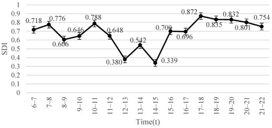 The SDI was relatively high during the morning and night, and reached a low level between 12:00 and 15:00. After 15:00, the SDI gradually increased, and reached a peak of 0.827 between 17:00 and 18:00, and then gradually decreased once again (Figure 8).