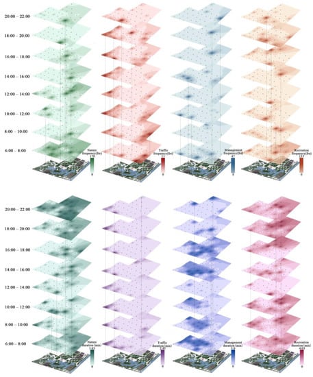 Recreation sound was relatively evenly distributed between 6:00 and 8:00, and was either concentrated in the central square or a large hard area of the node. Areas that had a higher frequency of sound from badminton being played or the sound of clapping and stomping were Ficus microcarpa Garden, the south entrance square, the central Vase Square, and the north Bamboo Garden. Sound from the boulevard and children’s activity area lasted for a long time and mainly included the sound of music, children’s playing, and conversation. Between 8:00 and 16:00, the sound of music and conversation accounted for a large proportion, and their distribution was concentrated in a certain hard ground and tree covered environment. After 18:00, the sound of recreation covered the entire park again. The duration of the recreational sound increased significantly. The water features in the park did not play a significant role in attracting recreational sound.