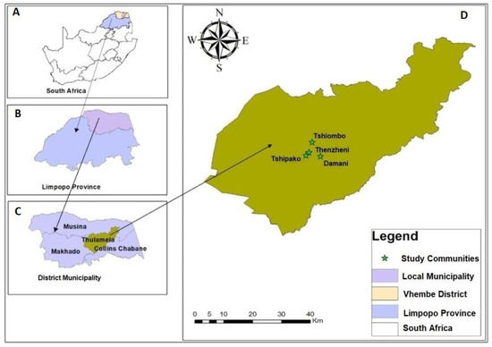 The study area was conducted in the Thulamela local municipality in the south-eastern part of the Soutpansberg Mountain range in the Vhembe Biosphere Reserve (VBR), South Africa. The VBR was recognised and designated in 2009 by the United Nations Educational, Scientific and Cultural Organisation (UNESCO) [19]. The Soutpansberg Mountain range is classified as the centre for botanical endemism in southern Africa and the biodiversity hotspot of South Africa [20,21]. The study was conducted in four villages (Damani (22°50′45 S, 30°31′38 E), Thenzheni (22°49′54 S, 30°28′57 E), Tshiombo (22°48′30 S, 30°30′53 E) and Tshipako (22°51′14 S, 30°28′59 E)) located in Thulamela Municipality, Vhembe District, Limpopo province, which is part of the VBR (Figure 1). The study area is characterised by tropical climatic conditions with high annual precipitation, which favours both agriculture and forestry activities [22]. The traditional agroforestry landscape of the VBR consists of different agroforestry practices and land uses including alley cropping, home-gardens, windbreaks, silvopasture, trees on farms, live fences, protected areas, communal land use areas and forests [23]. The local people of VBR conserve indigenous tree species within and outside the homesteads. Such indigenous trees are commonly used for timber, medicine, wild fruits, fuelwood, fodder, wild food, timber, soil improvement, fencing and building materials [22].